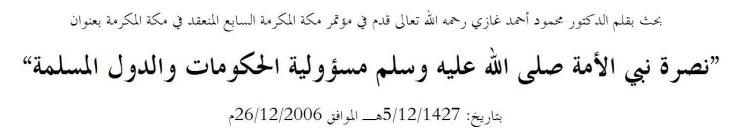 December 1, 2011February 15, 2012The Editor - MahmoodGhazi.org Paper presented in the Seventh Conference of Makkah Al Mukkarramah “The Responsibilities of Muslim Governments and States with regards to Preserving the Sanctity of the Messenger of the Ummah صلى الله عليه وسلم” A Paper presented in Arabic by Dr. Mahmood Ahmad Ghazi رحمه الله تعالى in the Seventh Conference of Makkah Al Mukkarramah. Date: 05/12/1427 A.H. , 26/12/2006 C.E. Please click below to view/download the paper: نصرة نبي الأمة صلى الله عليه وسلم مسؤولية الحكومات والدول المسلمة Source: http://themwl.org/subjects/default.aspx?ct=1&cid=24&l=ar Share this:Share Click to email a link to a friend (Opens in new window) Email Click to print (Opens in new window) Print Click to share on Facebook (Opens in new window) Facebook Click to share on X (Opens in new window) X Like Loading... Related